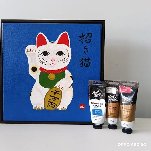 The textured result you see on the Maneki-neko painting was achieved using the budget-friendly Mont Marte Dimension Acrylics!